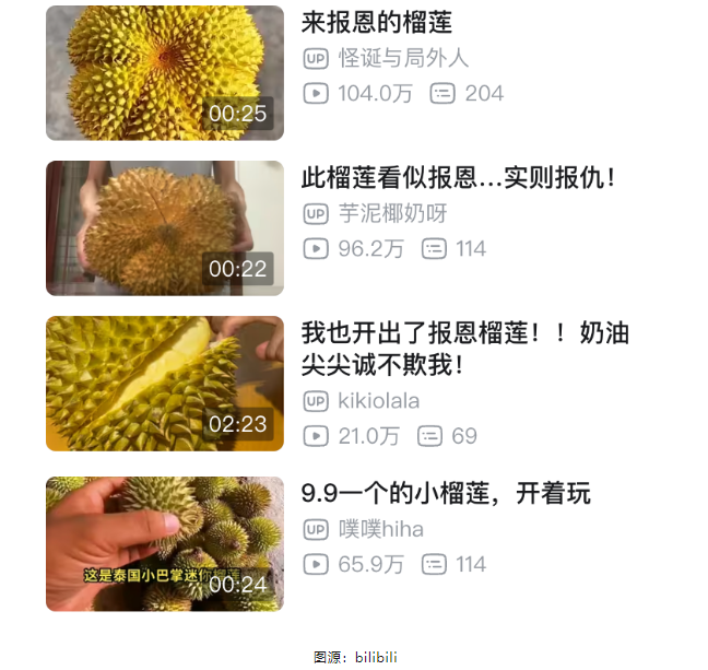 5月份,隨著氣溫升高,榴蓮季來臨,一些社交媒體和短視頻平臺中,“開榴蓮盲盒”相關(guān)的話題和瀏覽量暴漲,開到5房6房肉的榴蓮被稱為“報(bào)恩榴蓮”,開到皮厚肉小的則被戲稱為“榴蓮糖”。這種幽默的調(diào)侃以及沉浸式的剝榴蓮解壓視頻出現(xiàn)跟風(fēng)現(xiàn)象,越來越多的用戶購買榴蓮后,主動將開盲盒經(jīng)歷上傳零售平臺及社交媒體,這在一定程度上刺激榴蓮銷量大增。