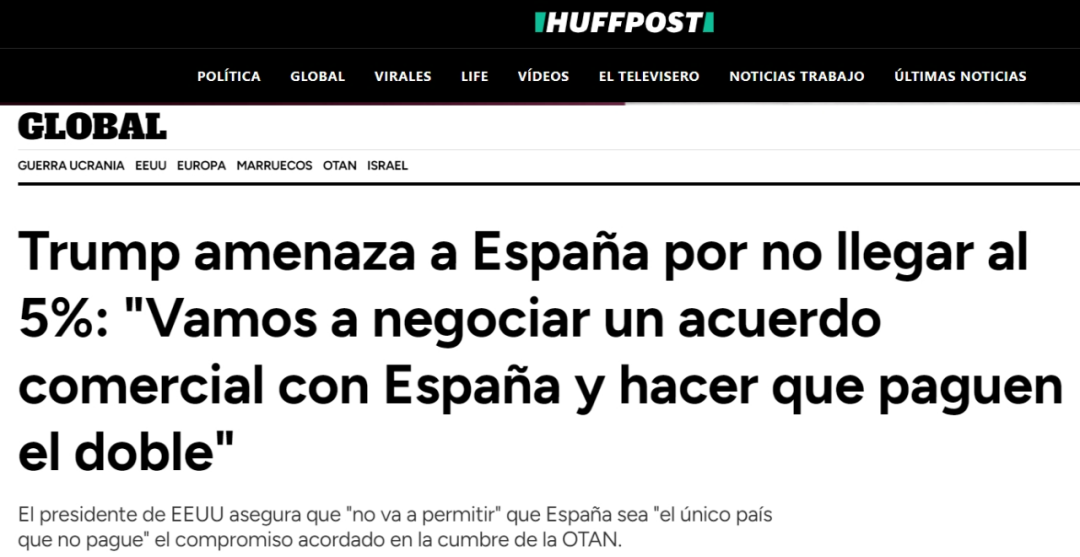 當(dāng)?shù)貢r(shí)間25日,美國總統(tǒng)特朗普在北約峰會上抨擊西班牙拒絕接受北約制定的新防務(wù)開支目標(biāo),并暗示可能對西班牙征收雙倍關(guān)稅以作為懲罰。