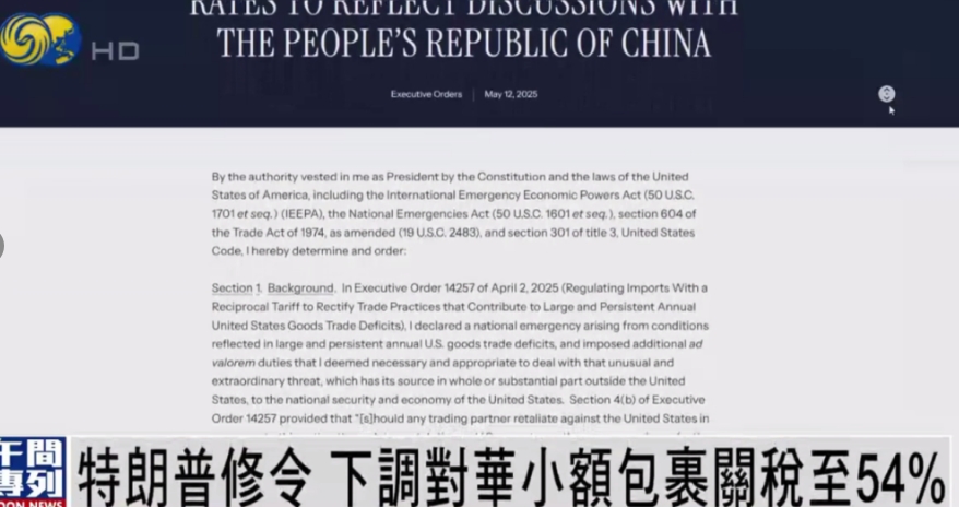 5月13日,美國白宮官網(wǎng)發(fā)布行政命令,修正價(jià)值低于800美元小額包裹的從價(jià)關(guān)稅稅率,從120%降低到54%。