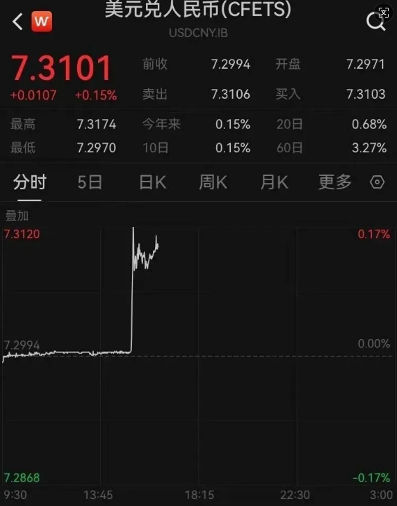 具體而言,在岸人民幣對美元匯率一度下跌超過100個基點,并跌破7.3的關(guān)口,盤中最低點達到7.3174,這是自2023年11月以來的首次。同時,離岸人民幣對美元匯率也跌破7.35,觸及最低點7.3575。