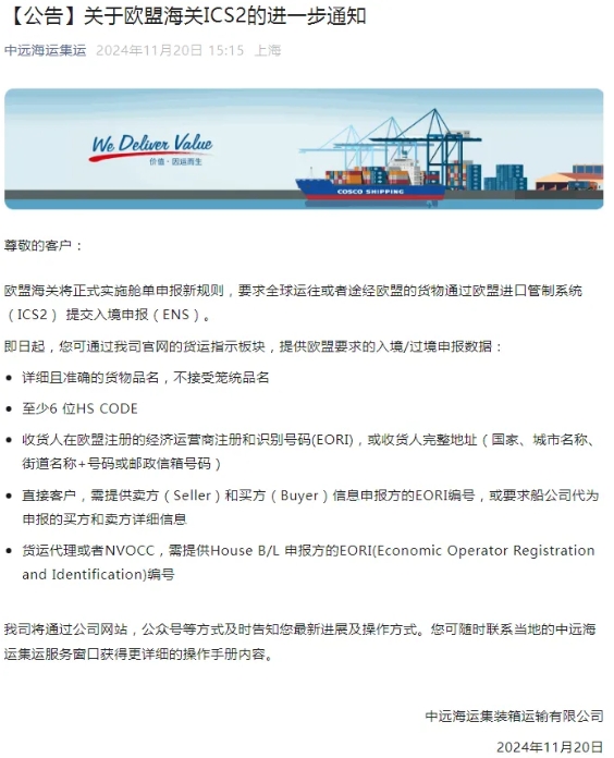 尊敬的客戶:歐盟海關(guān)將正式實施艙單申報新規(guī)則,要求全球運往或者途經(jīng)歐盟的貨物通過歐盟進(jìn)口管制系統(tǒng) (ICS2) 提交入境申報(ENS)。即日起,您可通過我司官網(wǎng)的貨運指示板塊,提供歐盟要求的入境/過境申報數(shù)據(jù):