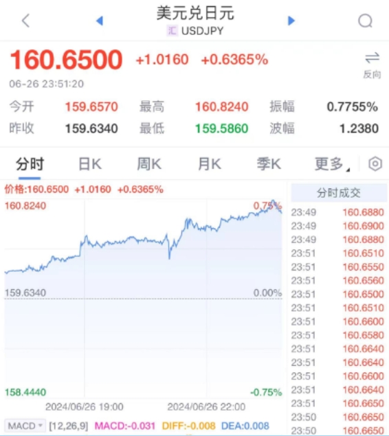 日元又崩了!26日晚最大的海外市場(chǎng)消息就是,日元又新低了!6月26日消息,據(jù)日本共同社報(bào)道,在26日的外匯市場(chǎng)上,日元匯率驟降,直接跌破160關(guān)口,甚至一度跌至1美元兌160.65日元。刷新1986年12月以來(lái)最低紀(jì)錄,跌至38年最低。