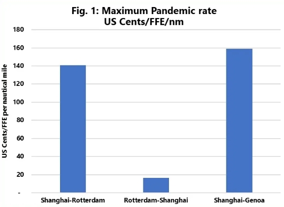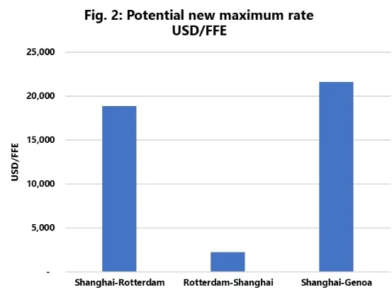 基于這一歷史數(shù)據(jù),Sea-Intelligence推測(cè)了在當(dāng)前危機(jī)持續(xù)下,結(jié)合新的航行距離,每FFE可能的現(xiàn)貨運(yùn)費(fèi)水平。結(jié)果顯示,如果每海里的費(fèi)率達(dá)到疫情期間的水平,那么從上海到鹿特丹的即期運(yùn)費(fèi)可能高達(dá)18900美元/FFE,從上海到熱那亞的運(yùn)費(fèi)可能達(dá)到21600美元/FFE,而從鹿特丹到上海的回程運(yùn)費(fèi)則可能達(dá)到2200美元/FFE。