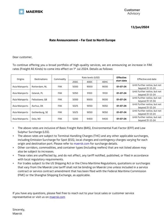 與此同時(shí),海運(yùn)市場(chǎng)繼續(xù)呈現(xiàn)上漲態(tài)勢(shì)。13日,馬士基發(fā)布公告,宣布上調(diào)亞歐航線的FAK費(fèi)率,最高漲至9400美元/FEU,這一調(diào)整將于7月1日正式生效。市場(chǎng)普遍預(yù)期,其他頭部船公司也將紛紛效仿,采取類(lèi)似的費(fèi)率調(diào)整措施。我們拭目以待,以觀察這一趨勢(shì)的進(jìn)一步發(fā)展。