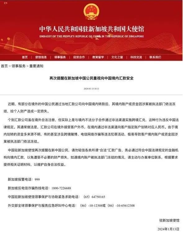 此前中國駐新加坡大使館也一再發(fā)文,提醒關于匯款安全的注意事項。