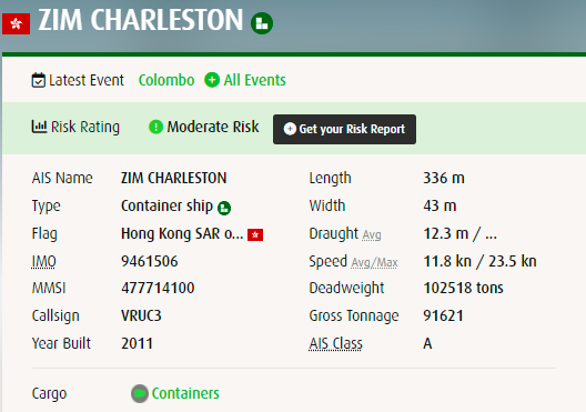集裝箱船“ZIM CHARLESTON”建造于2011年,懸掛香港區(qū)旗,運(yùn)力8586TEU,服務(wù)于以星亞洲內(nèi)部的China India Express III (CI3)航線,事發(fā)時(shí)執(zhí)行7W航次。7月份駛離中國(guó)前曾掛靠國(guó)內(nèi)多個(gè)港口。