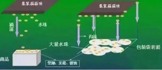 在集裝箱遠洋運輸或存儲過程中,貨柜往往會經歷高溫氣候及較強的晝夜溫差變化,溫度變化會在0-8攝氏度,濕度會高達98%,這就是凝露現(xiàn)象,當溫度為30度時,空氣中水含量為30.4g每平方米。當溫度由30攝氏度降低到18攝氏度,水蒸氣就會凝結成水滴,若是40英尺貨柜則產生1000克的冷凝水,就會造成“集裝箱雨”。