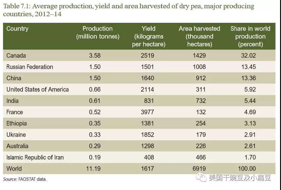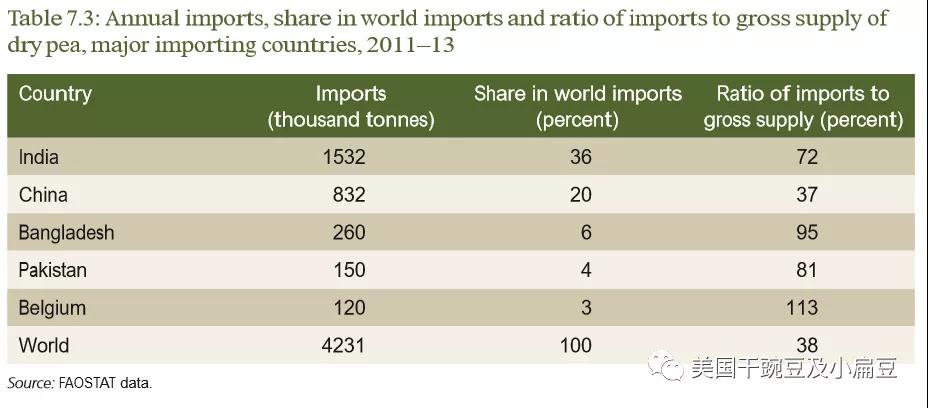 該報告指出,在2011-2013年中,干豌豆的主產(chǎn)地分別是加拿大、俄羅斯、中國、美國、印度、法國、埃塞俄比亞、烏克蘭、澳大利亞和伊朗,其中加拿大(32%)、俄羅斯(13%)和中國(13%)占了全球產(chǎn)量的58%。干豌豆產(chǎn)量整體呈下降趨勢,尤其中國的產(chǎn)量下降尤為明顯。中國已經(jīng)成為干豌豆的純進口。