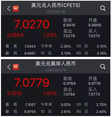 離岸、在岸人民幣雙雙“破7”