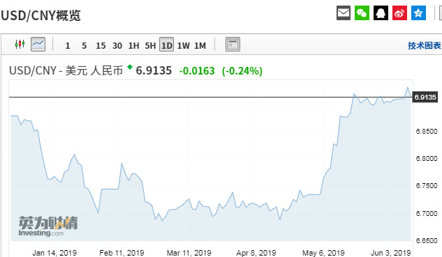 北京時(shí)間6月7日周五10點(diǎn)40左右,離岸人民幣對(duì)美元匯率顯著走低,隨后跌幅擴(kuò)大、一度出現(xiàn)短線急貶,連續(xù)跌破6.94、6.95關(guān)口。至16點(diǎn)左右,觸及6.9624,創(chuàng)2018年11月以來(lái)新低,日內(nèi)跌近400點(diǎn),跌幅至少為5月31日以來(lái)最大。不過(guò)短暫走低后,當(dāng)日晚間離岸人民幣匯率收復(fù)了這一關(guān)口。6月8日4點(diǎn)59分,離岸人民幣兌美元報(bào)6.9435元。