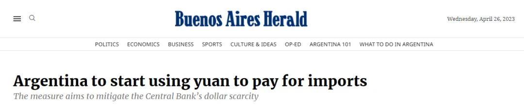 預(yù)計(jì)從5月份起,阿根廷還將使用人民幣支付價(jià)值相當(dāng)于7.9億至10億美元的中國(guó)進(jìn)口商品。