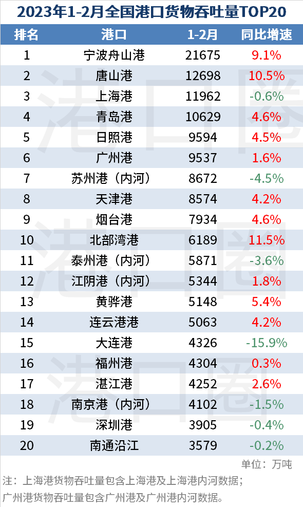 1-2月,全國港口貨物吞吐量前十名為:寧波舟山港(第1)、唐山港(第2)、上海港(第3)、青島港(第4)、日照港(第5)、廣州港(第6)、蘇州港(第7)、天津港(第8)、煙臺港(第9)、北部灣港(第10)。