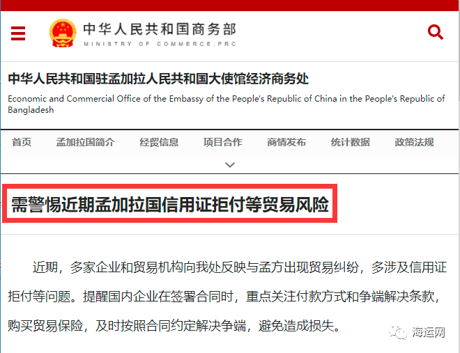 日前,中華人民共和國駐孟加拉人民共和國大使館經(jīng)濟商務(wù)處發(fā)布安全風(fēng)險提醒:近期,多家企業(yè)和貿(mào)易機構(gòu)向我處反映與孟方出現(xiàn)貿(mào)易糾紛,多涉及信用證拒付等問題。提醒國內(nèi)企業(yè)在簽署合同時,重點關(guān)注付款方式和爭端解決條款,購買貿(mào)易保險,及時按照合同約定解決爭端,避免造成損失。