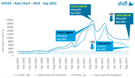 “金九銀十”的說法在全球海運(yùn)業(yè)曾經(jīng)也同樣適用,不過在今年的傳統(tǒng)旺季,海運(yùn)市場(chǎng)卻遭受陣陣寒流。主要海運(yùn)航線的運(yùn)價(jià)“斷崖式”暴跌,去年一飛沖天的海運(yùn)市場(chǎng)徹底“涼”了,現(xiàn)在海運(yùn)市場(chǎng)已經(jīng)從“賣方市場(chǎng)”轉(zhuǎn)變成為“買方市場(chǎng)”了。