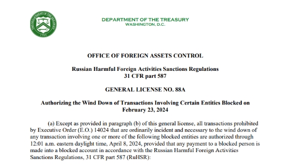 OFAC同時(shí)出具了通用許可證,批準(zhǔn)牽涉這些實(shí)體的相關(guān)交易在特定條件下及/或緩沖期內(nèi)(東岸夏令時(shí)間 2024年4月8日中午12:01之前)繼續(xù)進(jìn)行。