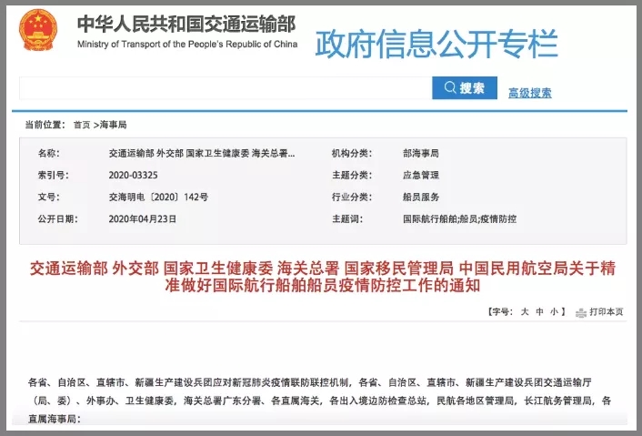 鑒于大量船舶投訴,4月22日,國家交通運輸部、外交部、衛(wèi)健委、海關總署、移民管理局、民航局6部委聯合發(fā)出《關于精準做好國際航行船舶船員疫情防控工作的通知》,對各港口平衡疫情防控和船員換班工作提出要求。