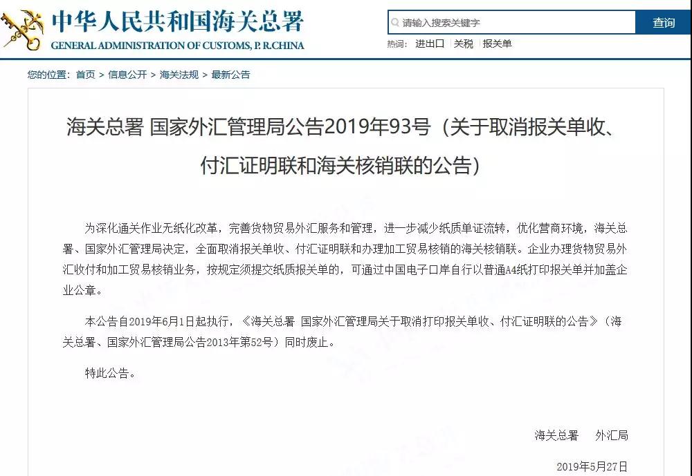 剛剛,海關總署、外匯局發(fā)布了關于取消報關單收、付匯證明聯(lián)和海關核銷聯(lián)的公告!